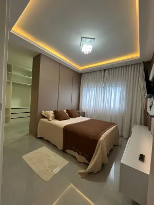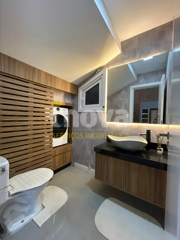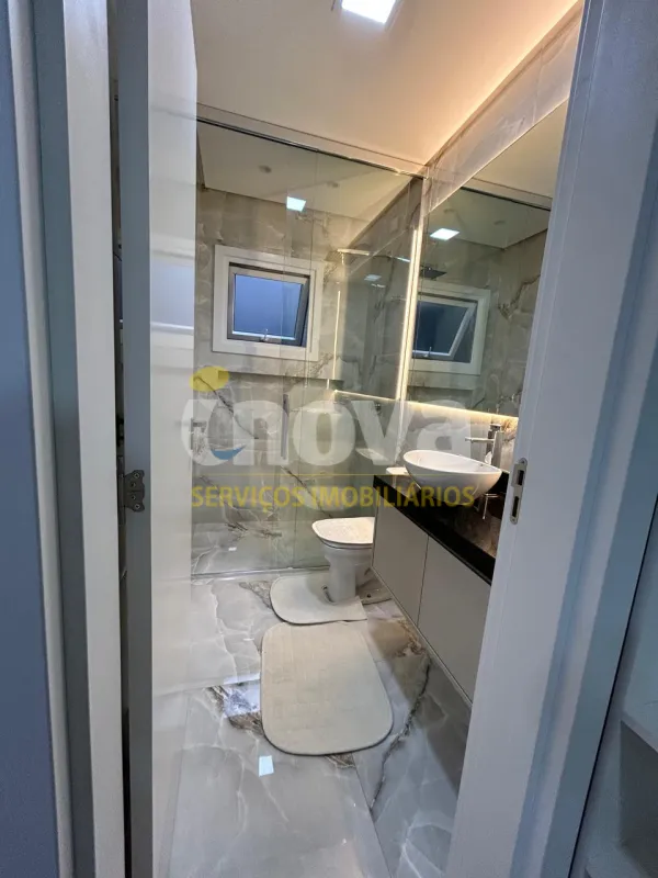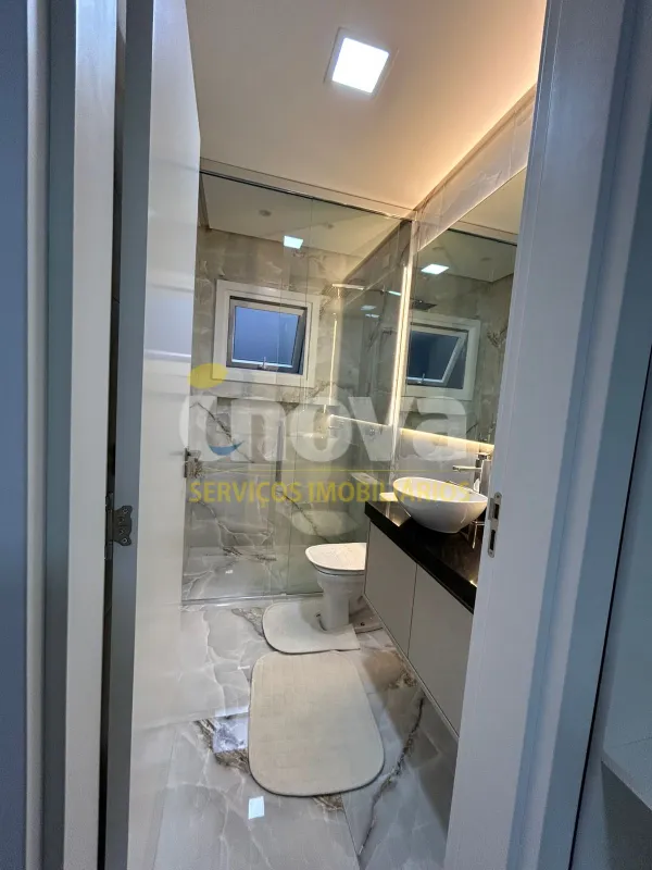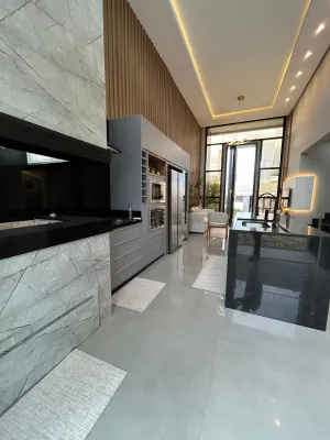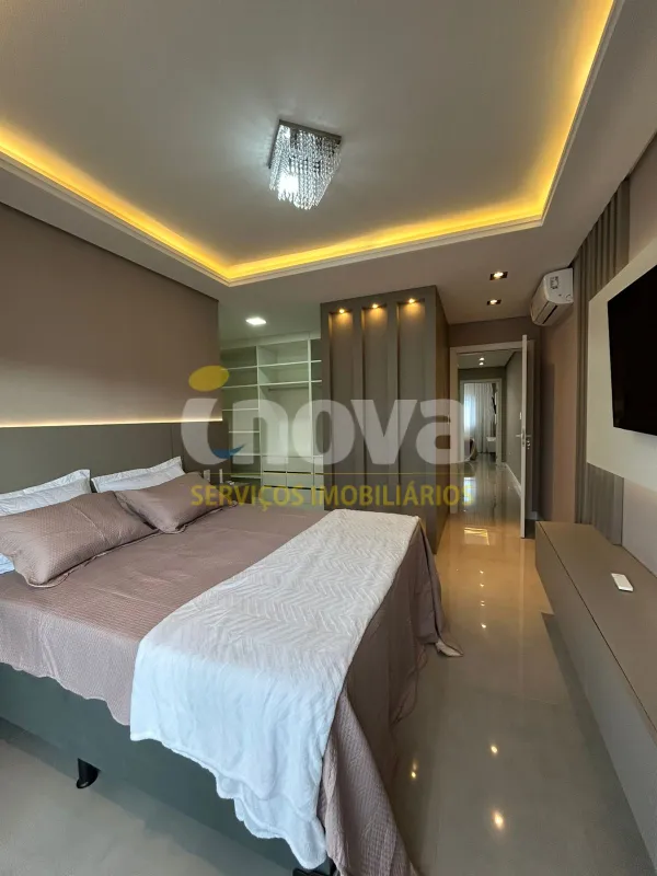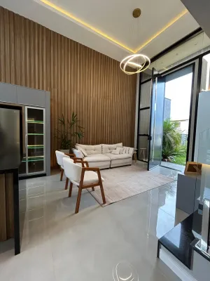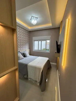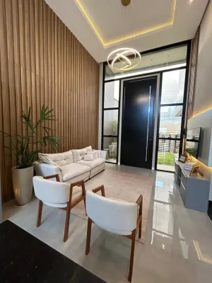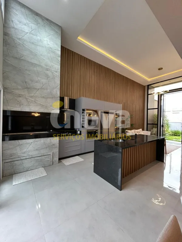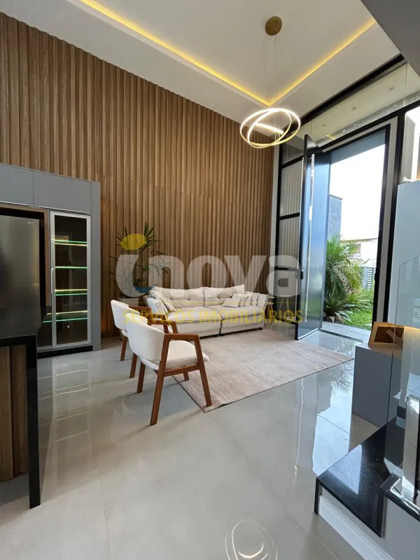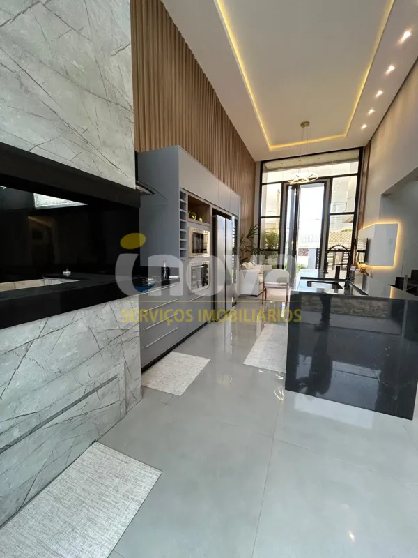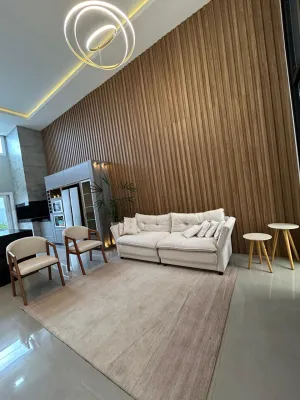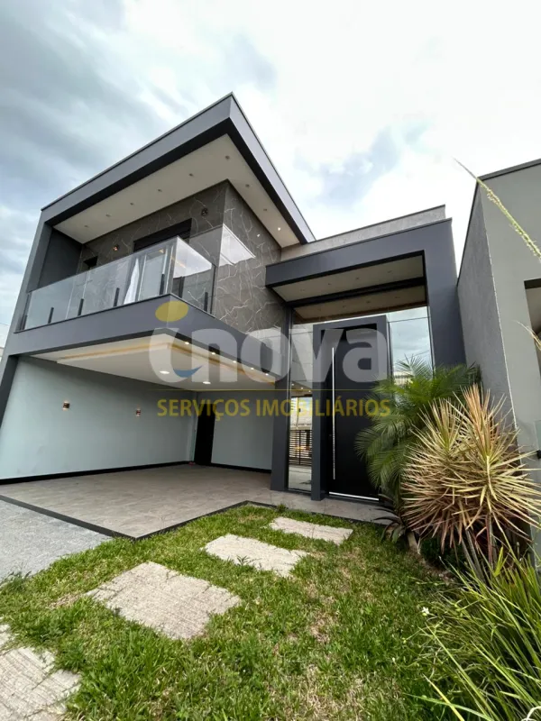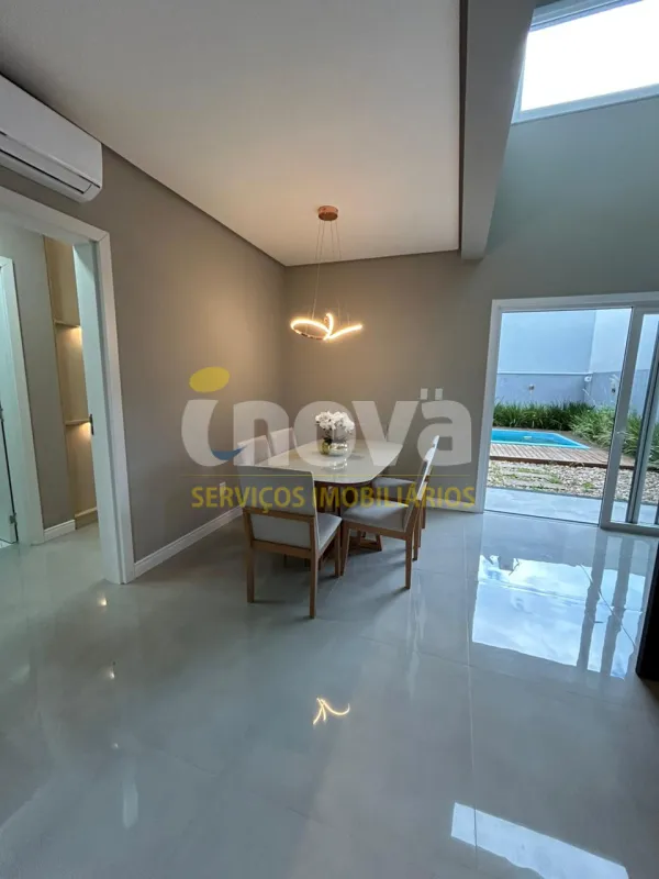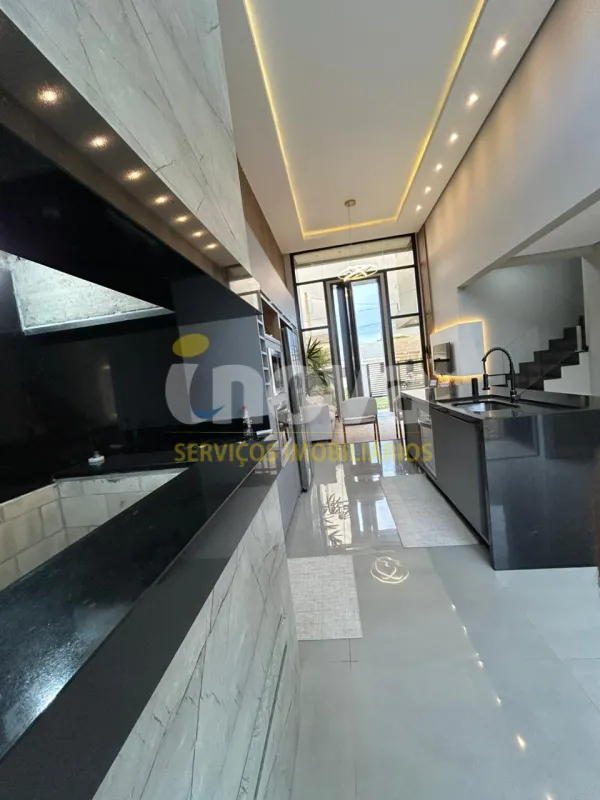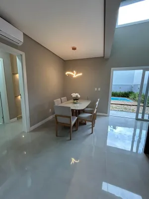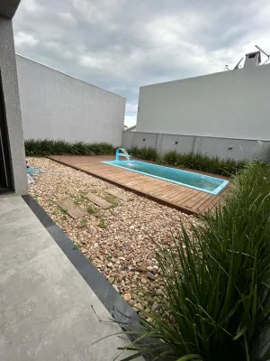 Linda casa de alto padrão construtivo, mobiliada com iluminação e aberturas em PVC automatizadas, composta por 03 suítes, living amplo integrando sala de estar e jantar com lareira, cozinha, 01 banheiro social, espaço gourmet com churrasqueira, abrigo coberto para carro, piscina, jardinagem, rebaixo em gesso, água quente, porcelanato e laje de concreto, mobiliada e decorada
