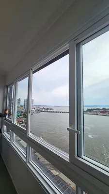 De frente para o rio, andar alto, com vista espetacular, com 2 dormitórios, sendo 1 suíte, sala ampla de estar e jantar com churrasqueira, cozinha, banheiro social, garagem, lavanderia, prédio com terraço na cobertura e salão de festas.